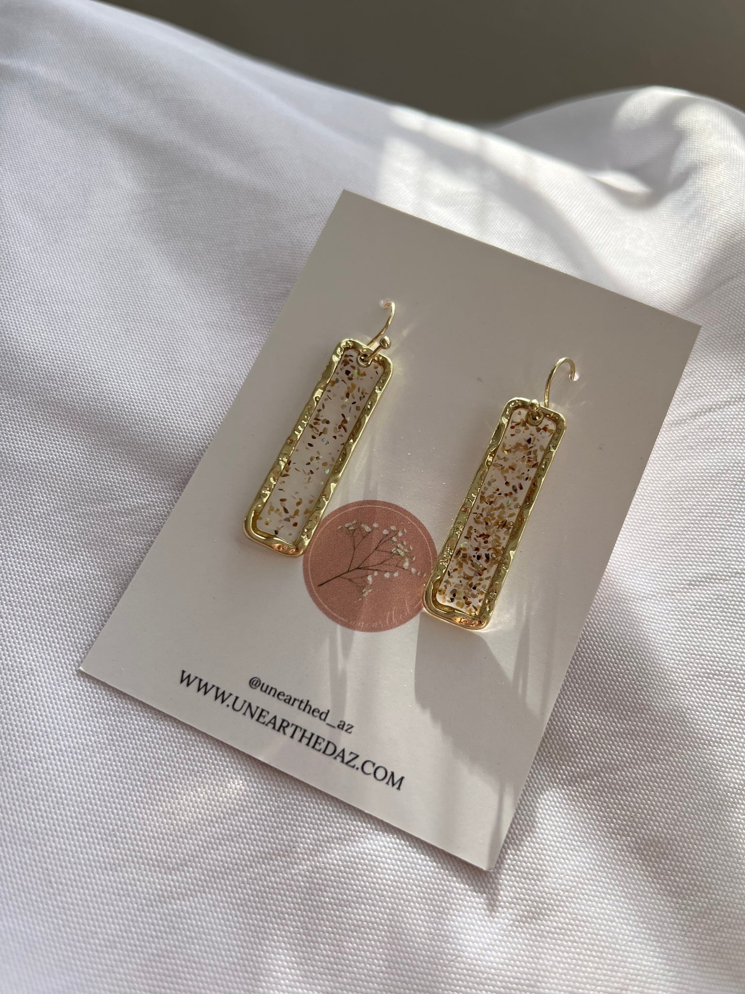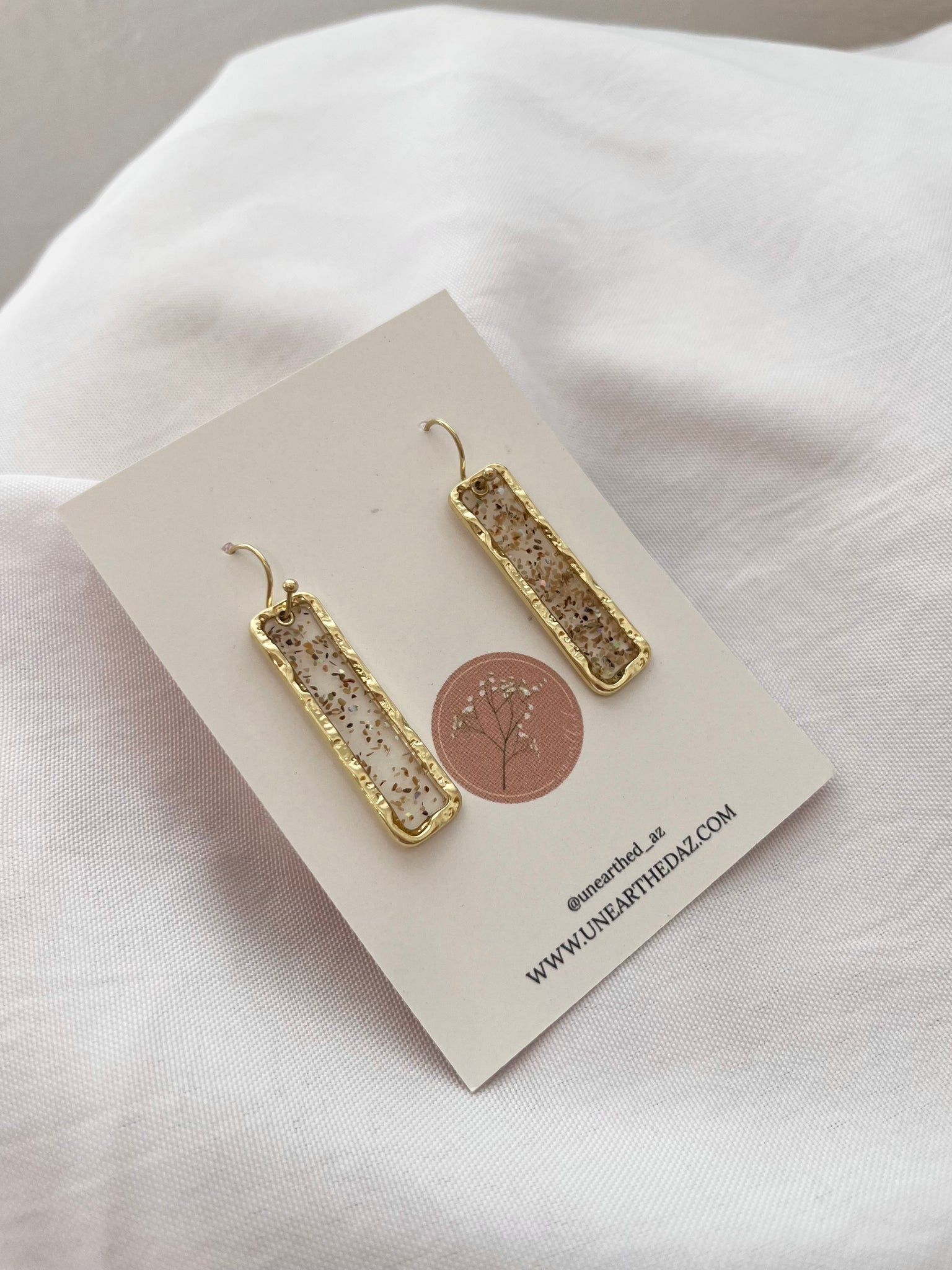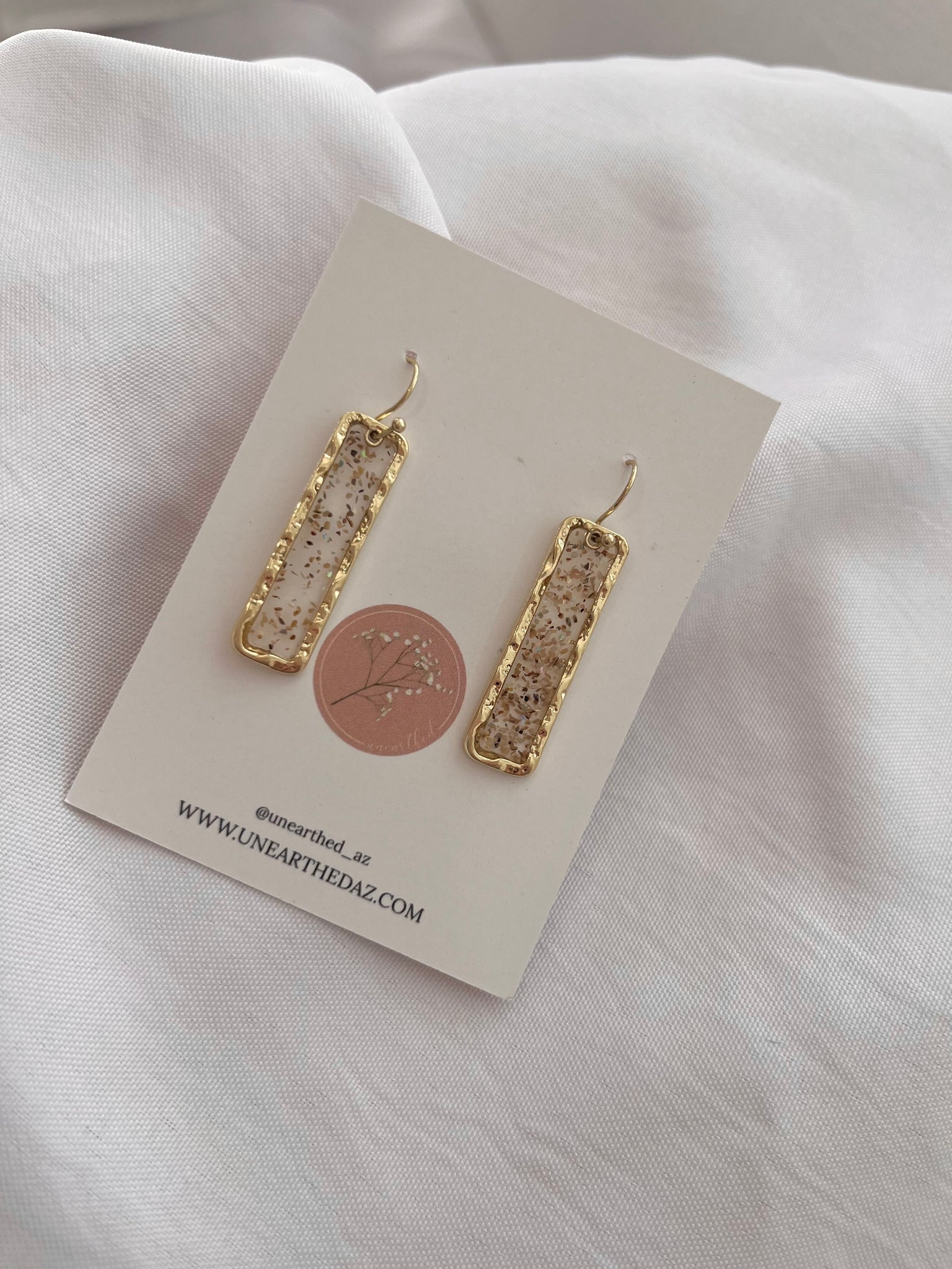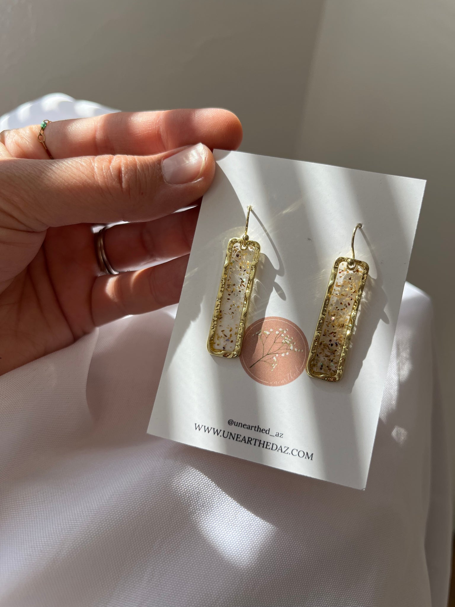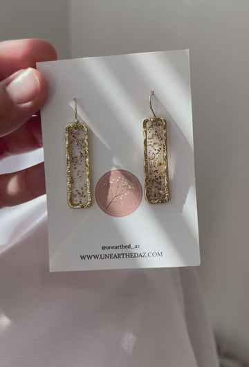Crushed rainbow abalone shells encapsulated in a golden resin filled frame. This earring is so simple, yet so elegant. It’s perfect for every day and a special occasion.