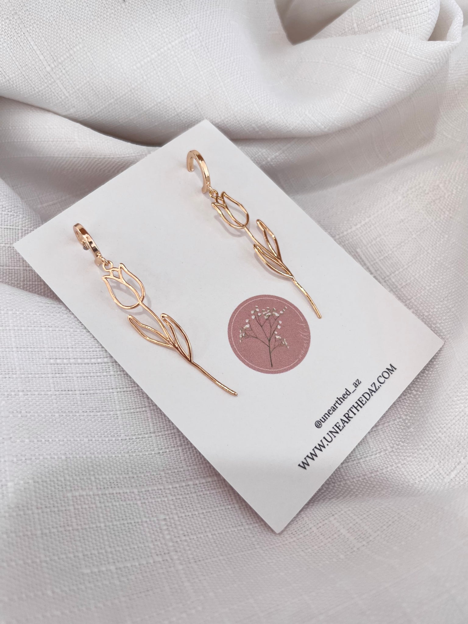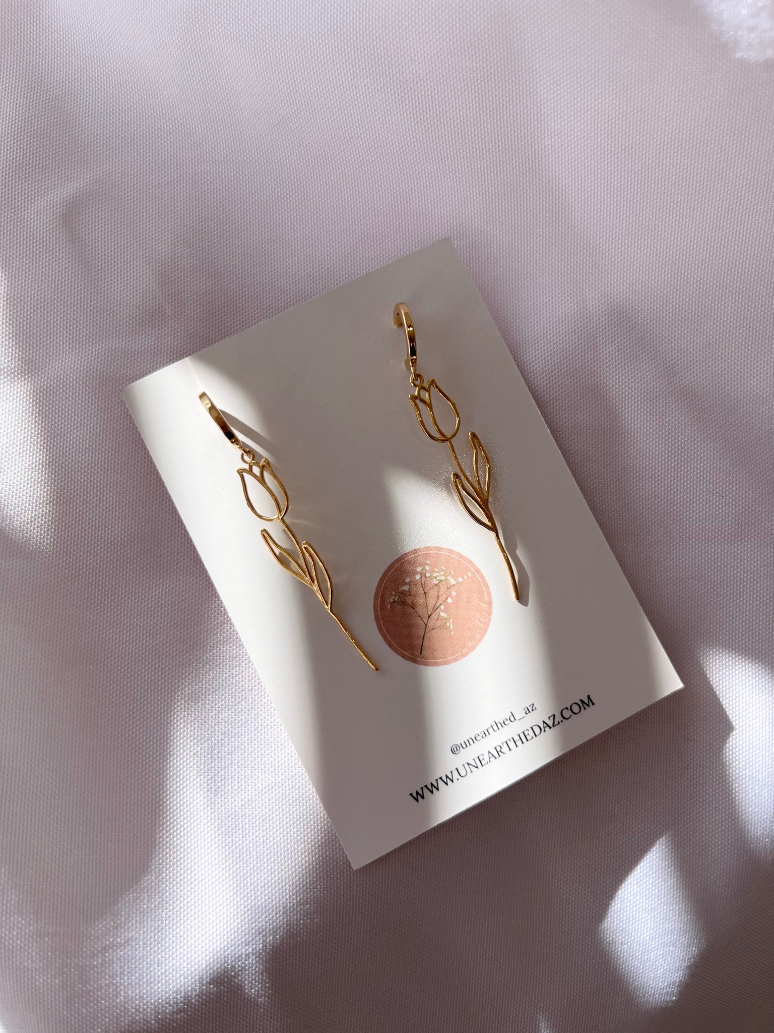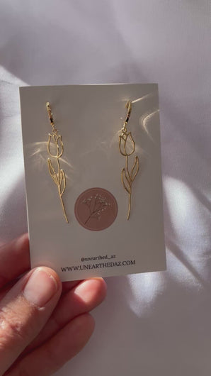 These pretty golden wire tulips are approximately 2”inches length and hang from a gold plated stainless steel half hoop!