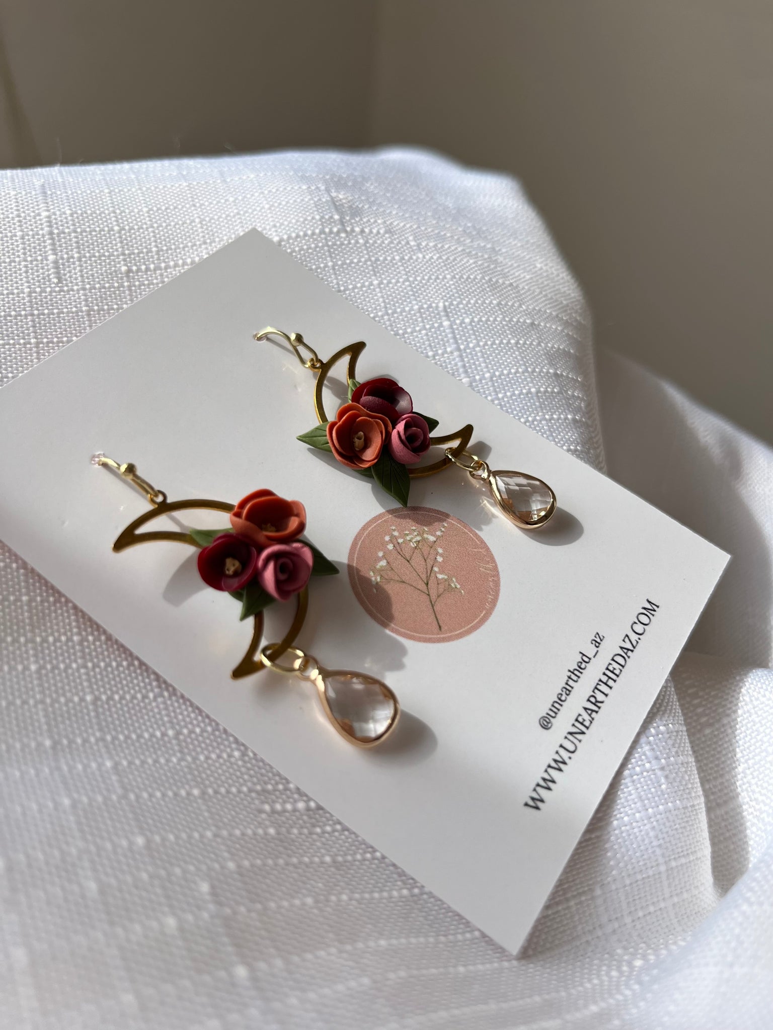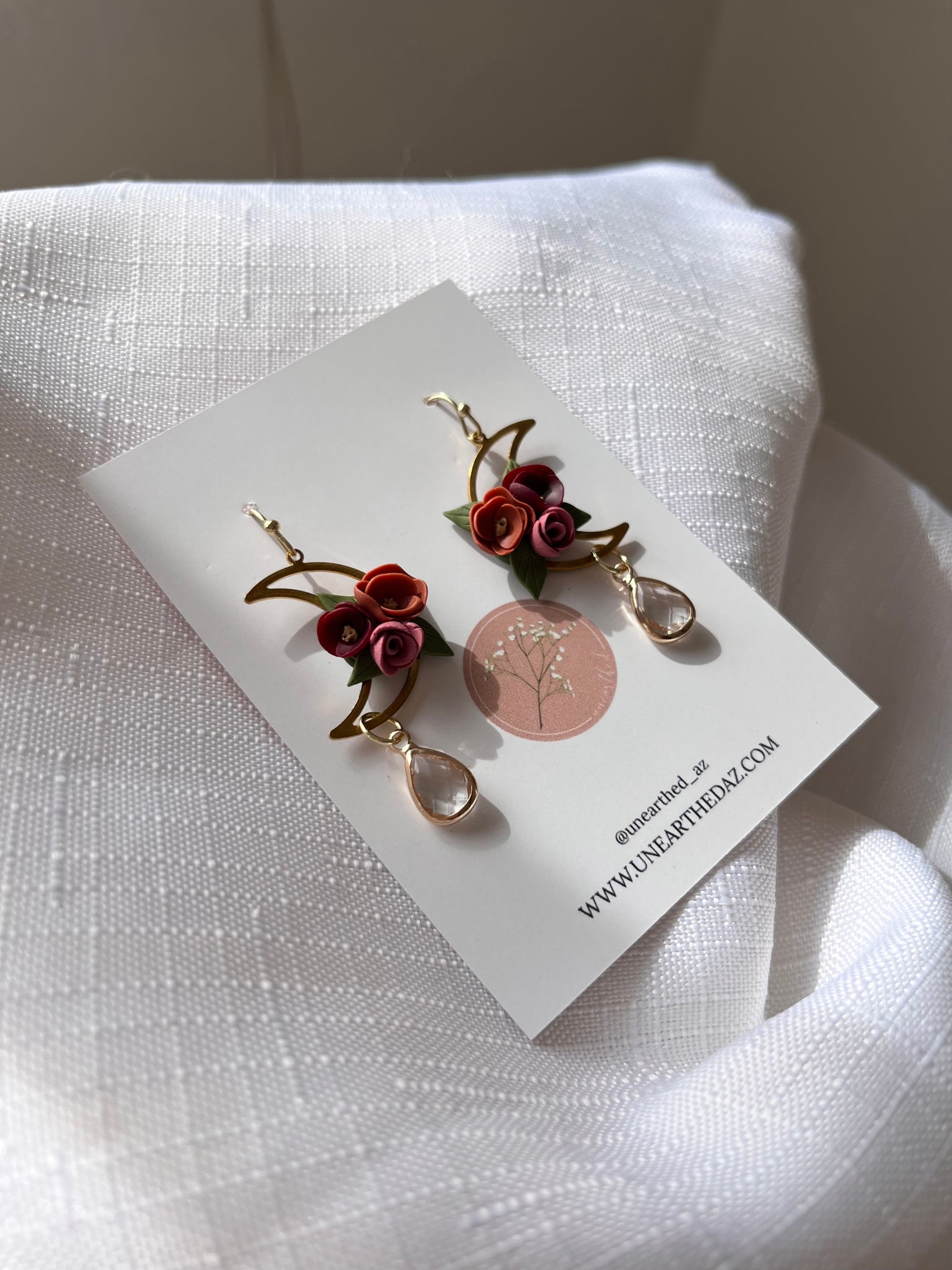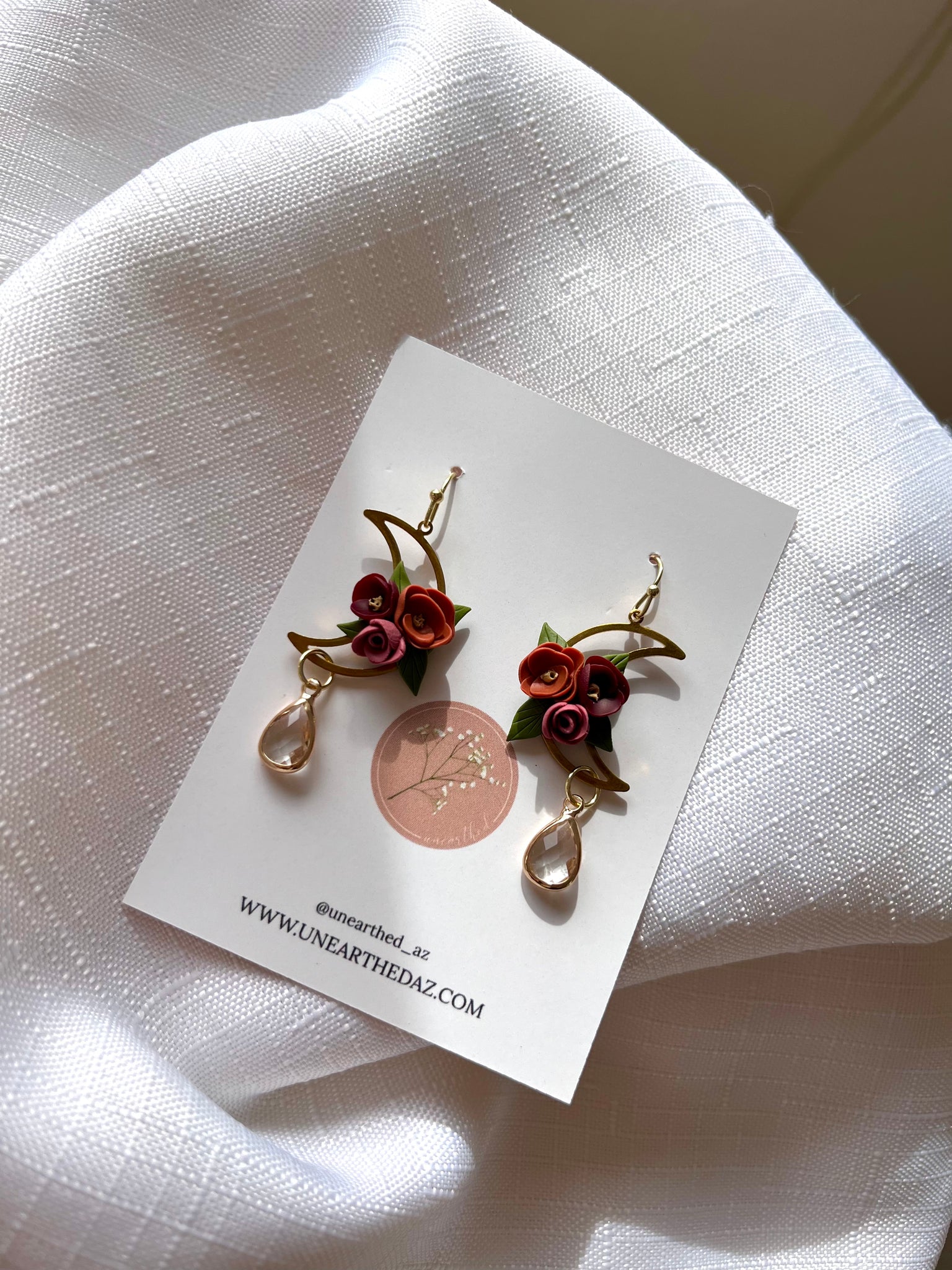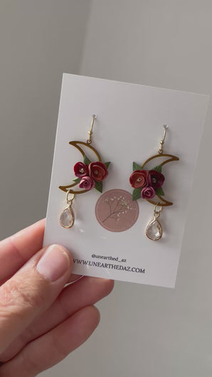 Handcrafted moody florals floating inside the moon and adorned with a gorgeous clear crystal. The crystal catches the light, adding so much more beauty to this set. The ear wire is gold plated stainless steel, nickel free, and hypoallergenic.