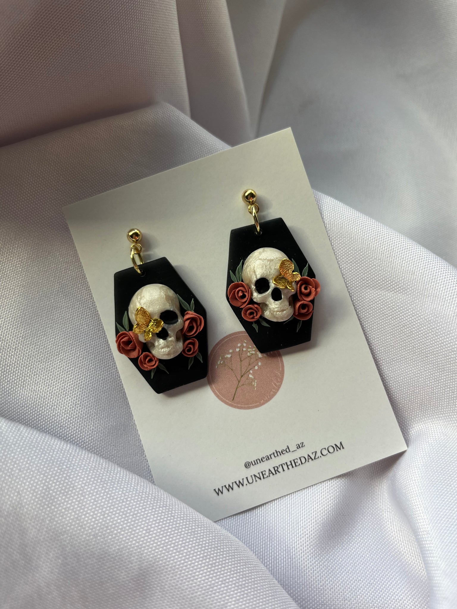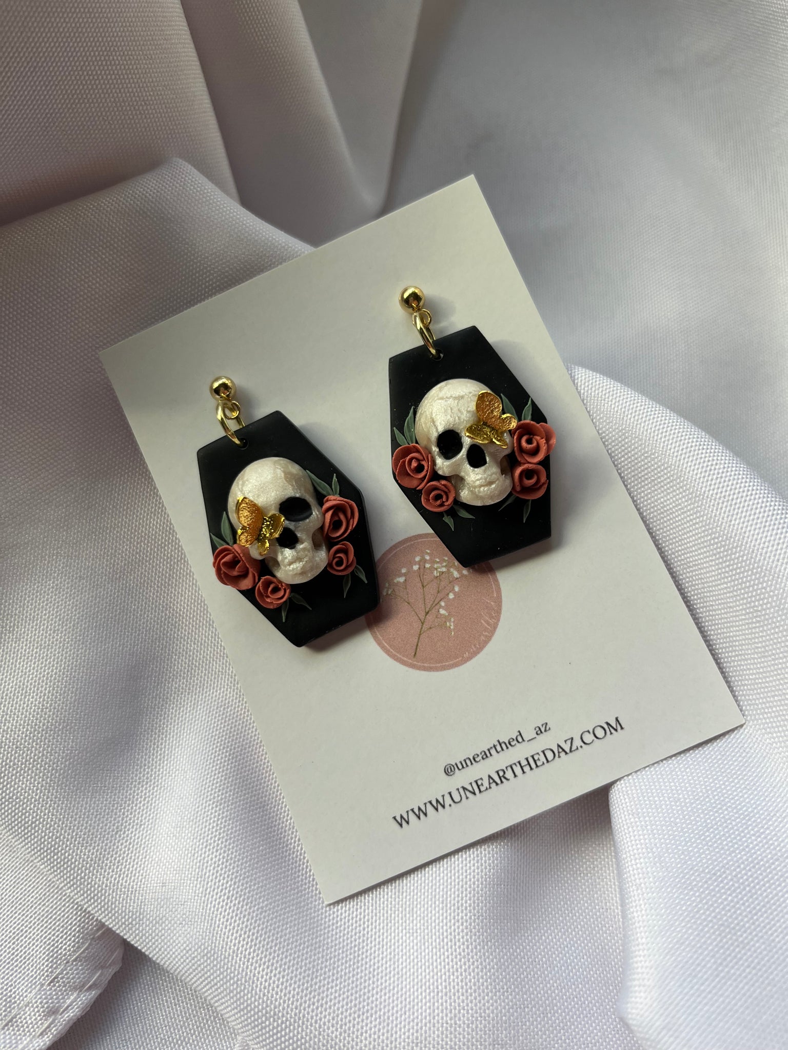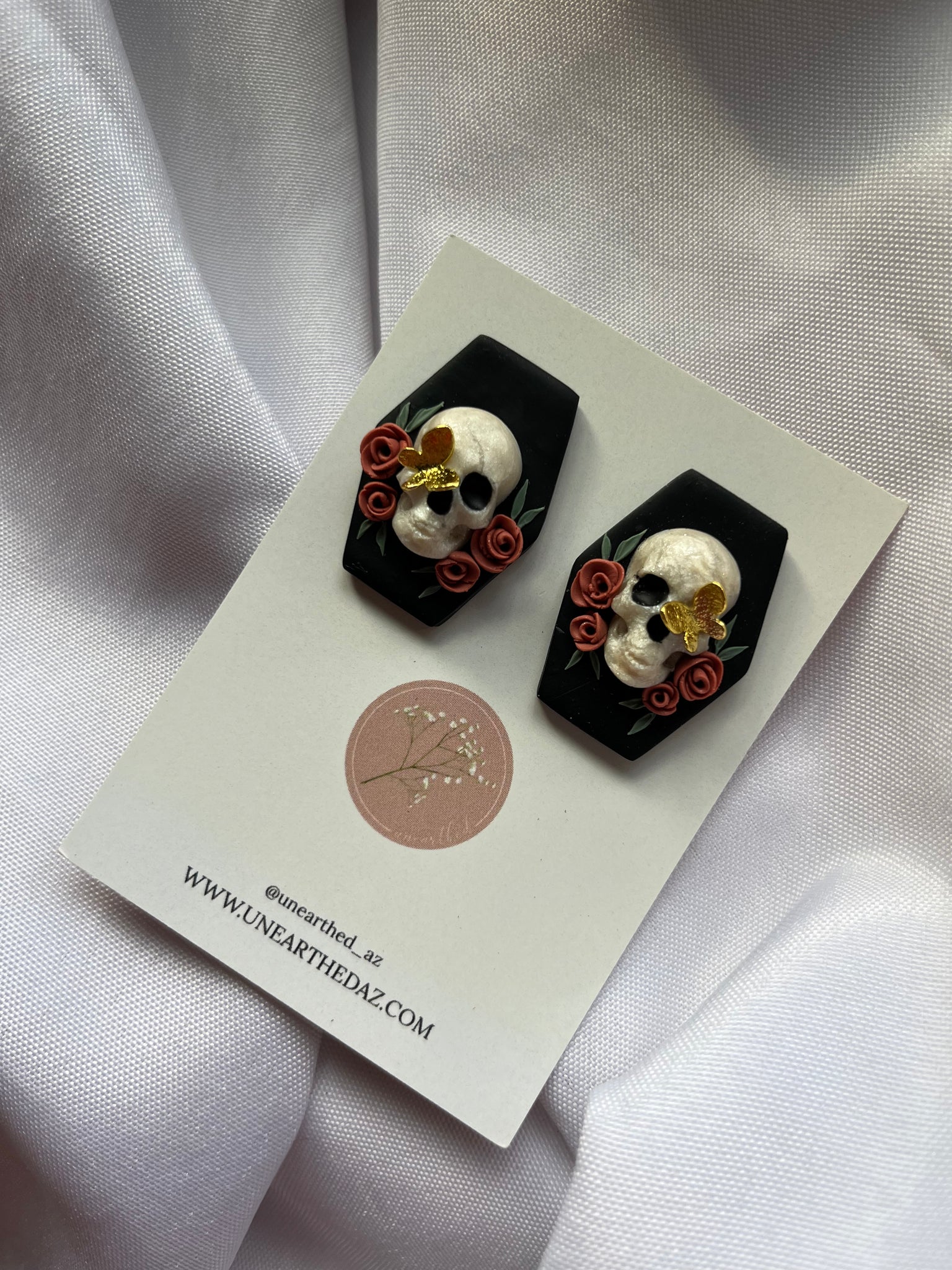 The Skull Coffin features a shimmering skull with a golden butterfly and handcrafted roses!